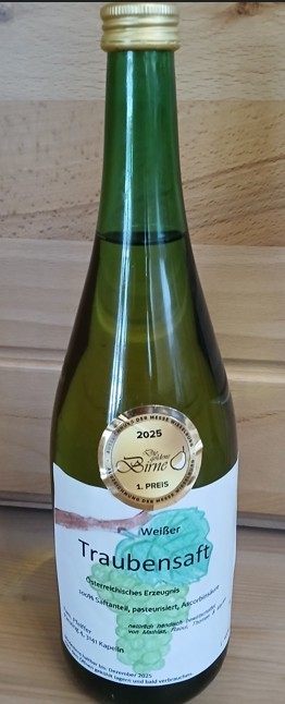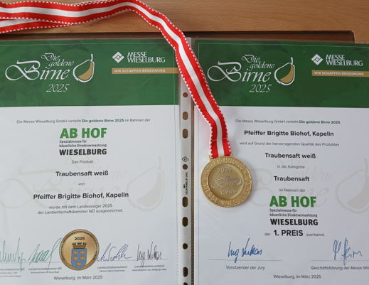 Wir haben bei der Abhof-Wieselburg (Goldene Birne 2025) mit unserem Traubensaft GOLD (1. Preis) gewonnen (siehe Fotos weiter unten)!!